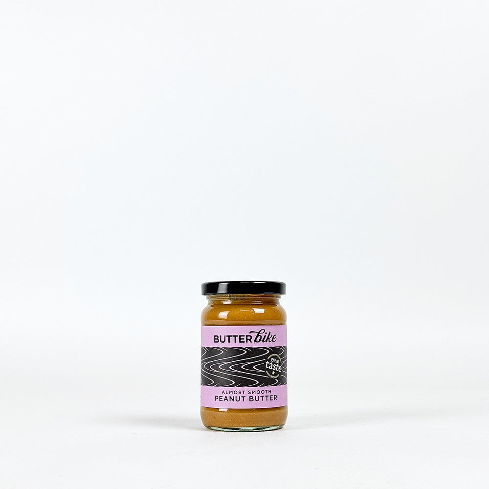 Butter Bike Co. Almost Smooth Peanut Butter. Naturally sweet, slow roasted peanuts blitzed to smooth and creamy perfection with a pinch of flaky Cornish sea salt.